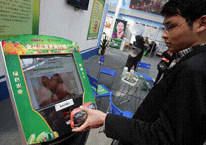 第十六届西洽会安徽展区内,一名工做人员将贴有指定标签包拆好的蔬菜正在“食物逃溯查询终端”系统上一扫,屏幕上当即显示出蔬菜的名称、编号、产地、农药残留检测成果和发卖地址等多种消息。图/CFP?。